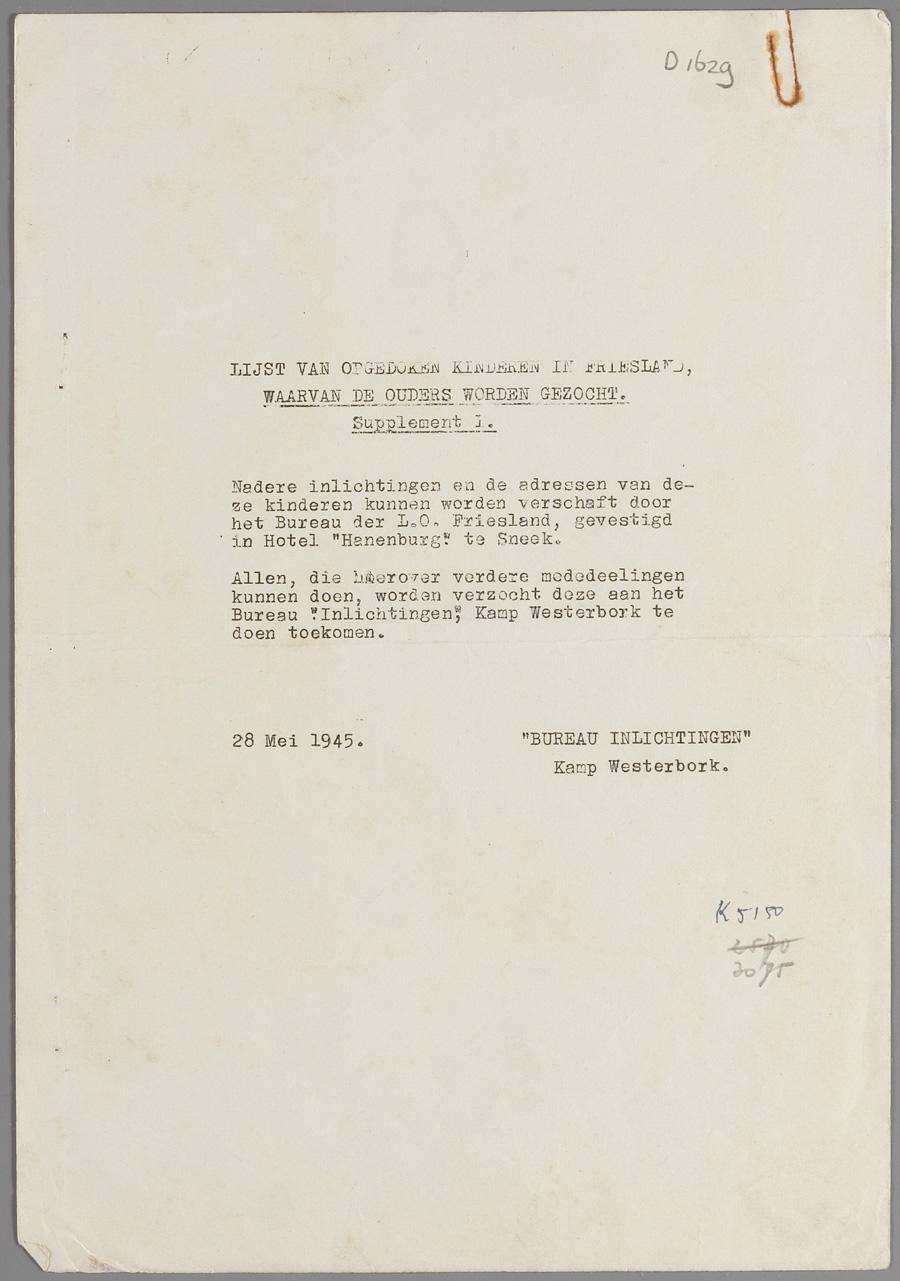 Naamlijst van opgedoken kinderen in Friesland waarvan de ouders worden gezocht, supplement I 1945 ; naamlijst van opgedoken kinderen in Almelo waarvan de ouders worden gezocht (supplement 2)