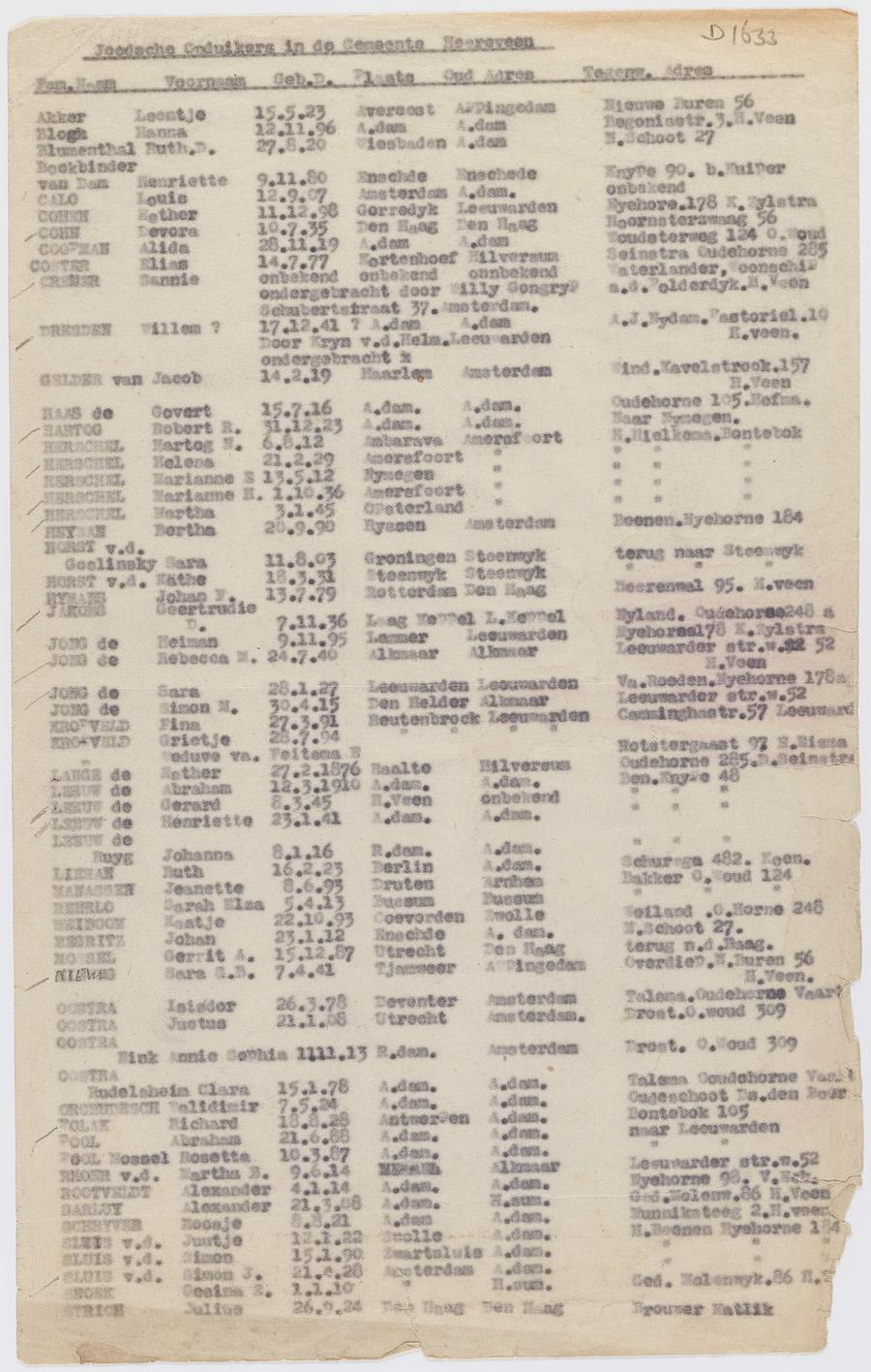 Lijst van Joodsche onderduikers (ruim 50) in de gemeente Heerenveen, met geb.datum, oud en nieuw adres.