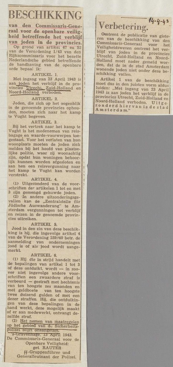 Twee krantenknipsels betreffende de beperkingen op het verblijf van joden in de provincies, d.d. 13 en 14 april 1943. Met ingang van 10 april 1943 was het al verboden voor joden om in de provincies Groningen, Friesland, Drenthe, Overijssel, Gelderland, Zeeland, Noord-Brabant en Limburg te verblijven. Op 23 april, zo werd op 13 april afgekondigd, kwamen daar de provincies Noord-Holland, Zuid-Holland en Utrecht bij. Een dag later werd de stad Amsterdam als uitzondering toegevoegd.