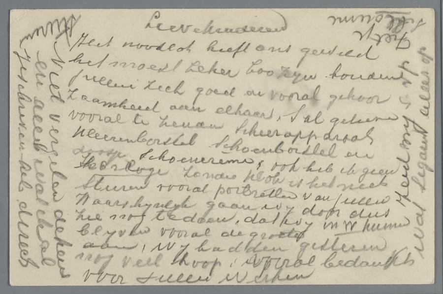 Briefkaart van Gabriel Staal en zijn echtgenote, verstuurd vanaf de Borneolaan in Amsterdam, voor deportatie, aan hun kinderen, de familie Boers en Staal, 1943 (?)