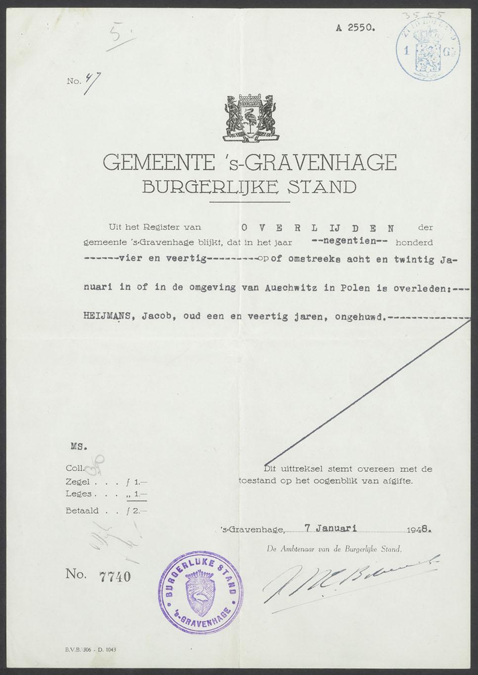 Uittreksel uit het register van overlijden t.n.v. J. Heijmans te Auschwitz, 1948