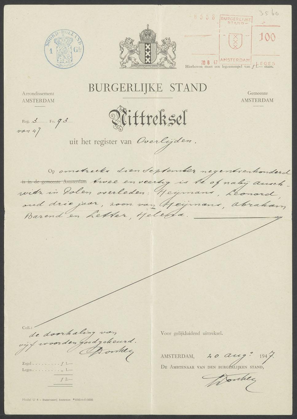Uittreksel uit het register van overlijden t.n.v. L. Heymans te Auschwitz (1942), 1947