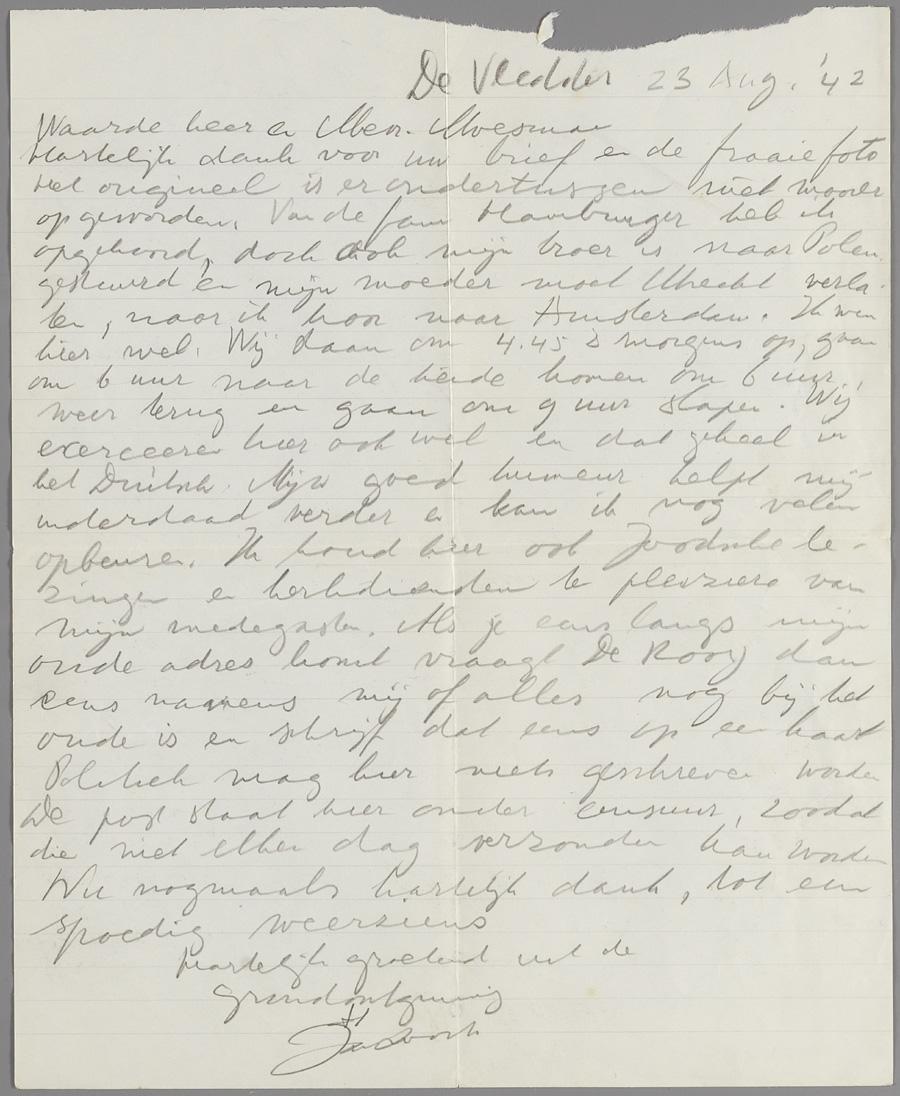 Brief van Jacob Zwarts uit werkkamp De Vledder aan dhr. en mevr. J. Moesman, augustus 1942