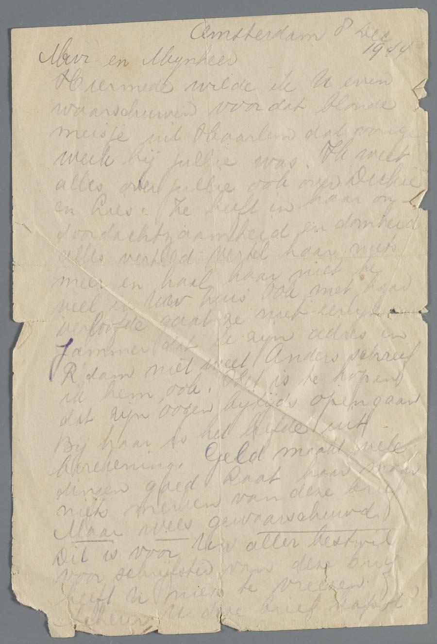 Handgeschreven brief van een buurtgenoot met waarschuwing aan onderduikers, december 1944