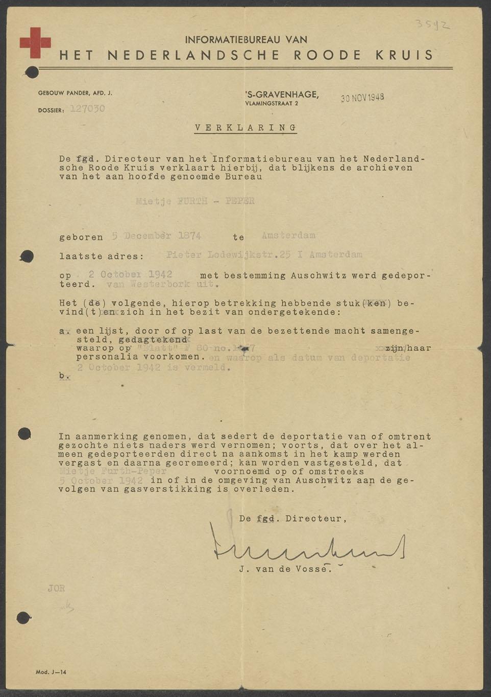 Verklaring van het Rode Kruis m.b.t. overlijden M. Furth-Peper te Auschwitz (1942), 1948