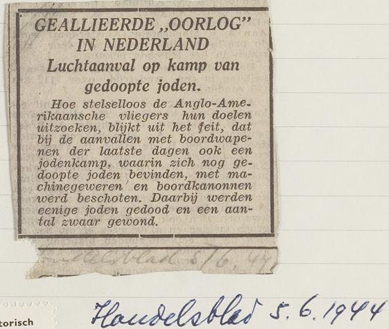 Krantenknipsel uit het Handelsblad over een geallieerde luchtaanval op een kamp met o.a. gedoopte joden, juni 1944