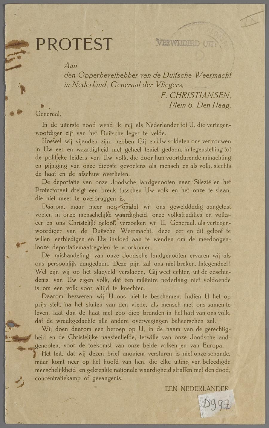 Pamflet gericht aan F. Christiansen, opperbevelhebber van de Duitse weermacht in Nederland, ondertekend door "een Nederlander" n.a.v. deportatie van joden, 1942
