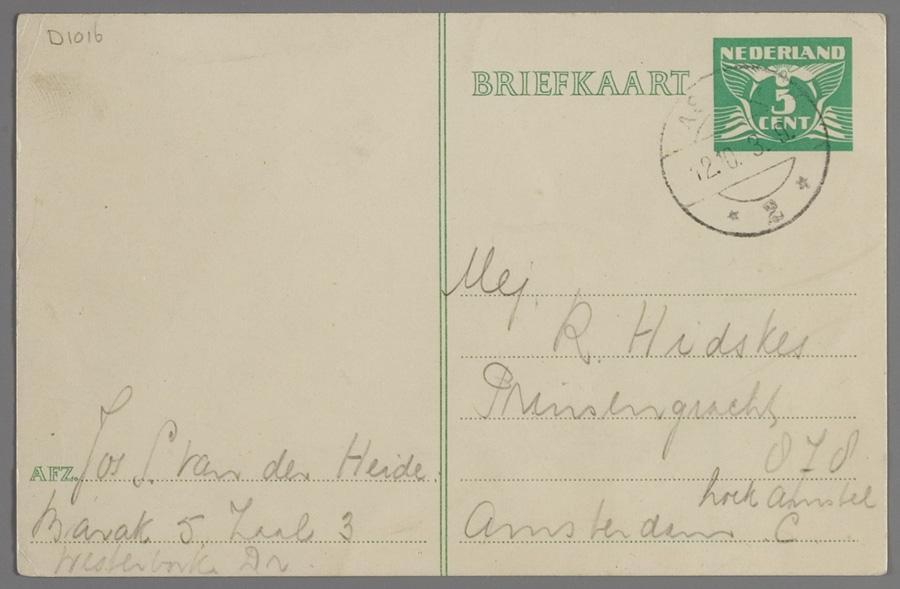 Briefkaart van Josephine van der Heide in Westerbork aan Rie Hidskes in Amsterdam, met dank voor ontvangen pakket, oktober 1943
