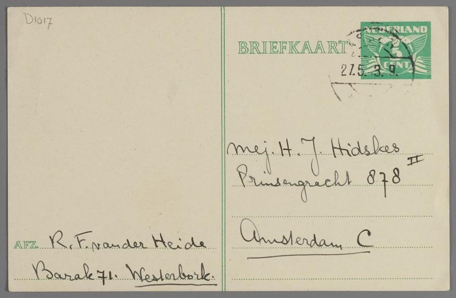Briefkaart van Gien van der Heide in Westerbork aan haar vriendin Rie Hidskes in Amsterdam met dank voor ontvangen pakket, mei 1943