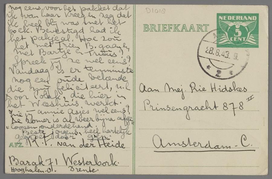 Briefkaart van Gien van der Heide in Westerbork aan haar vriendin Rie Hidskes in Amsterdam, augustus 1943