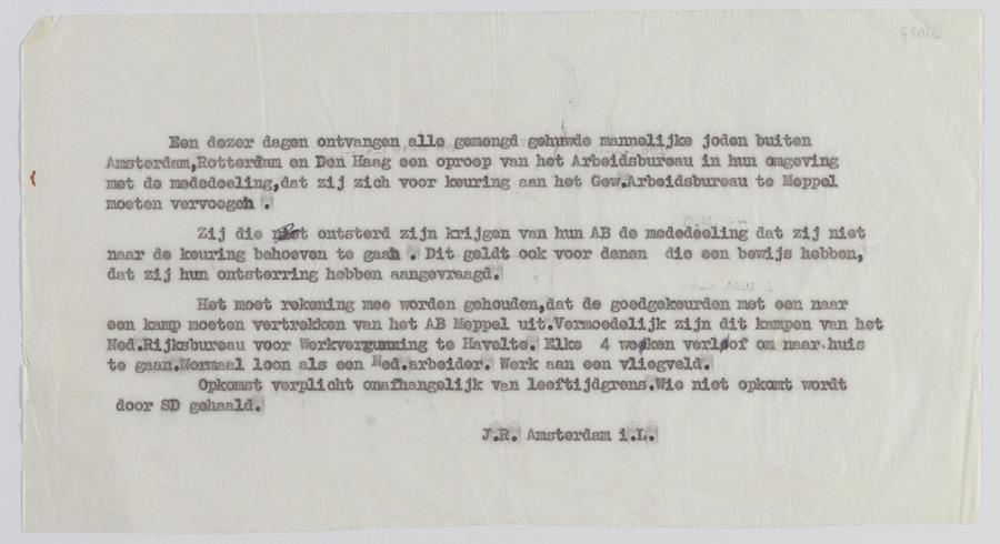 Mededeling van Joodse Raad over de plicht tot aanmelden voor werk in Drentse werkkampen, 1941