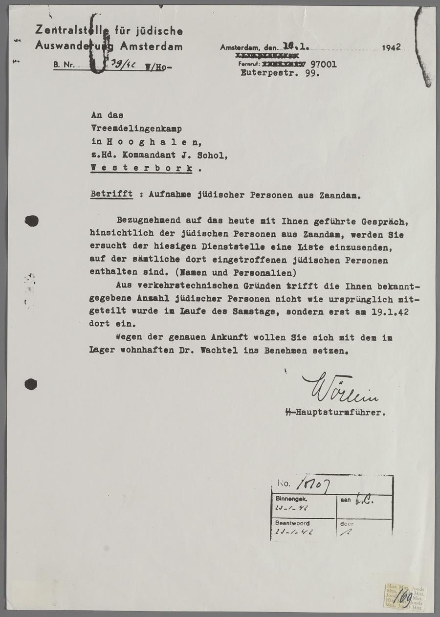 Kopie van brief van de Zentralstelle für Jüdische Auswanderung aan de commandant van vreemdelingenkamp Westerbork over het opnemen van geevacueeerde joden uit Zaandam, januari 1942