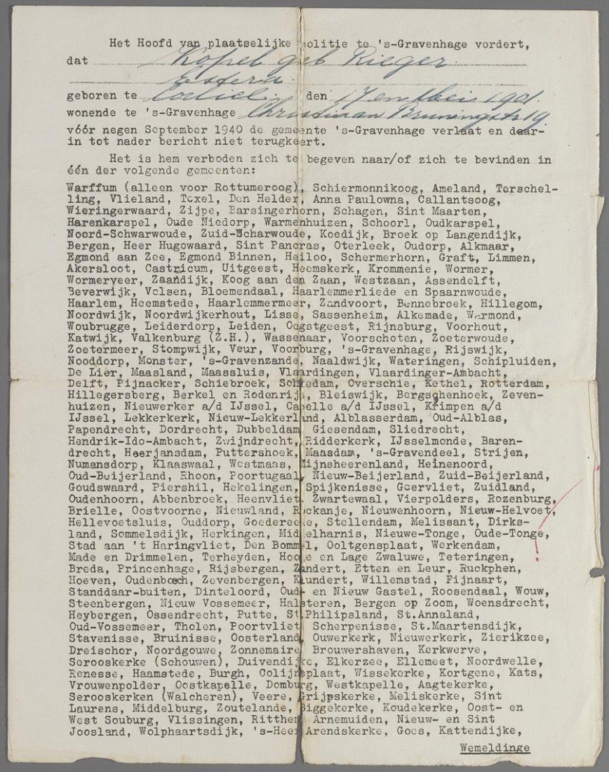 Bevel van gemeentepolitie Den Haag voor Ester Kopel-Rieger om haar woonplaats te verlaten, september 1940
