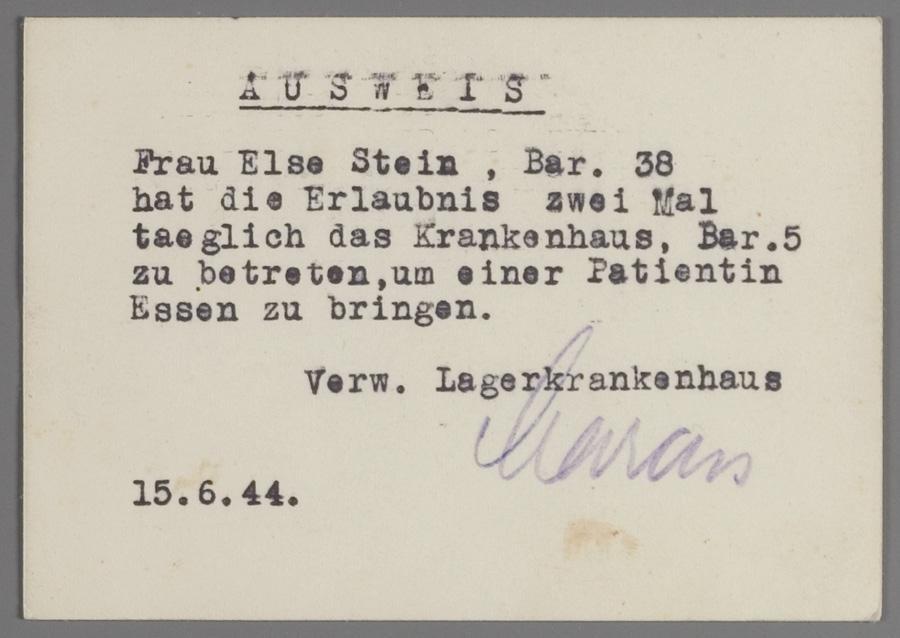 Vergunning, op naam van de gevangene en verpleegster Else Stein-Schlesinger, om twee maal per dag eten aan een patient te brengen in het kampziekenhuis van Westerbork, juni 1944