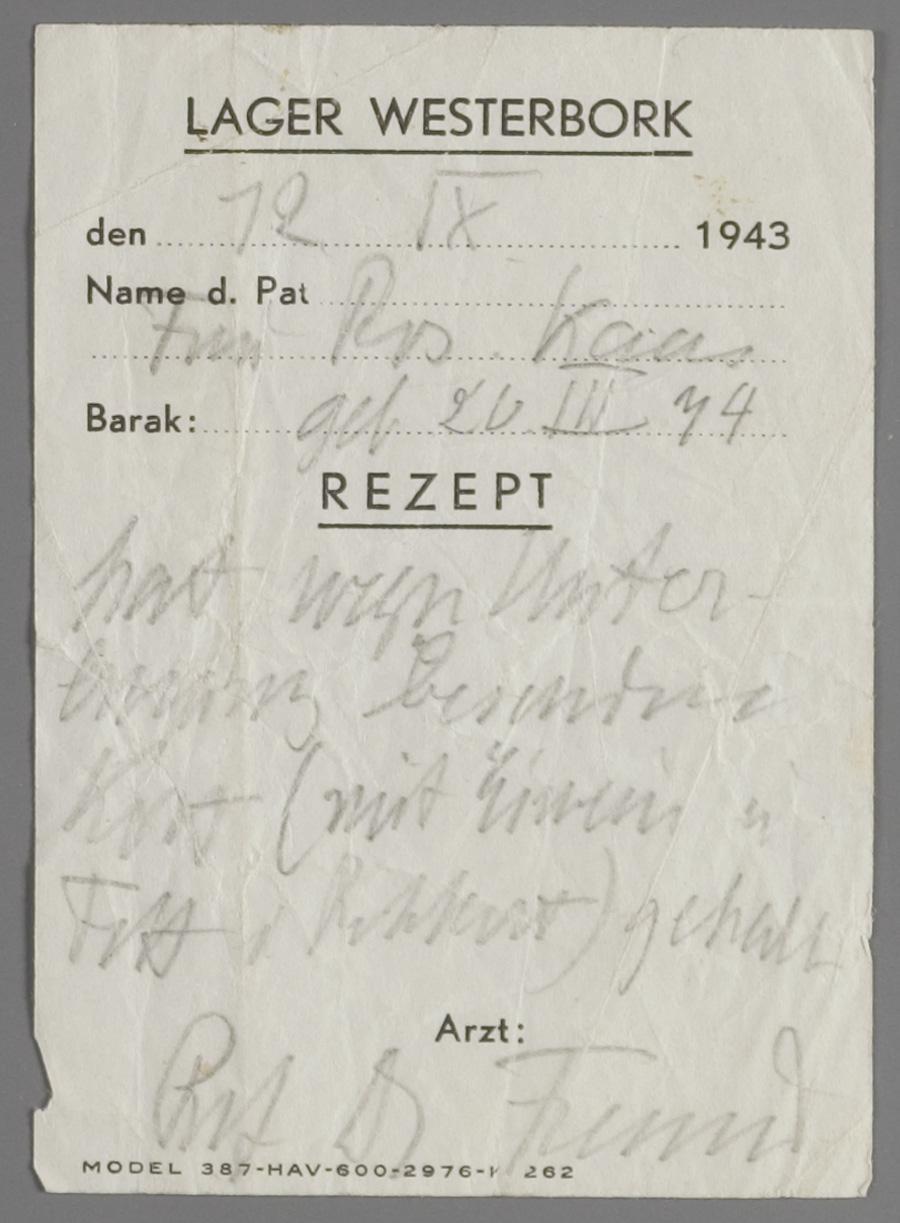 Mededeling van arts in kamp Westerbork betreffende de ondervoeding van Julia Kaas-Rozette, september 1943