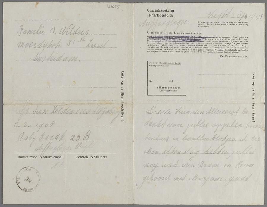 Gecensureerde brief van Susanna Zeldenrust-Wijnberg in kamp Vught aan G. Wilders in Amsterdam, maart 1943