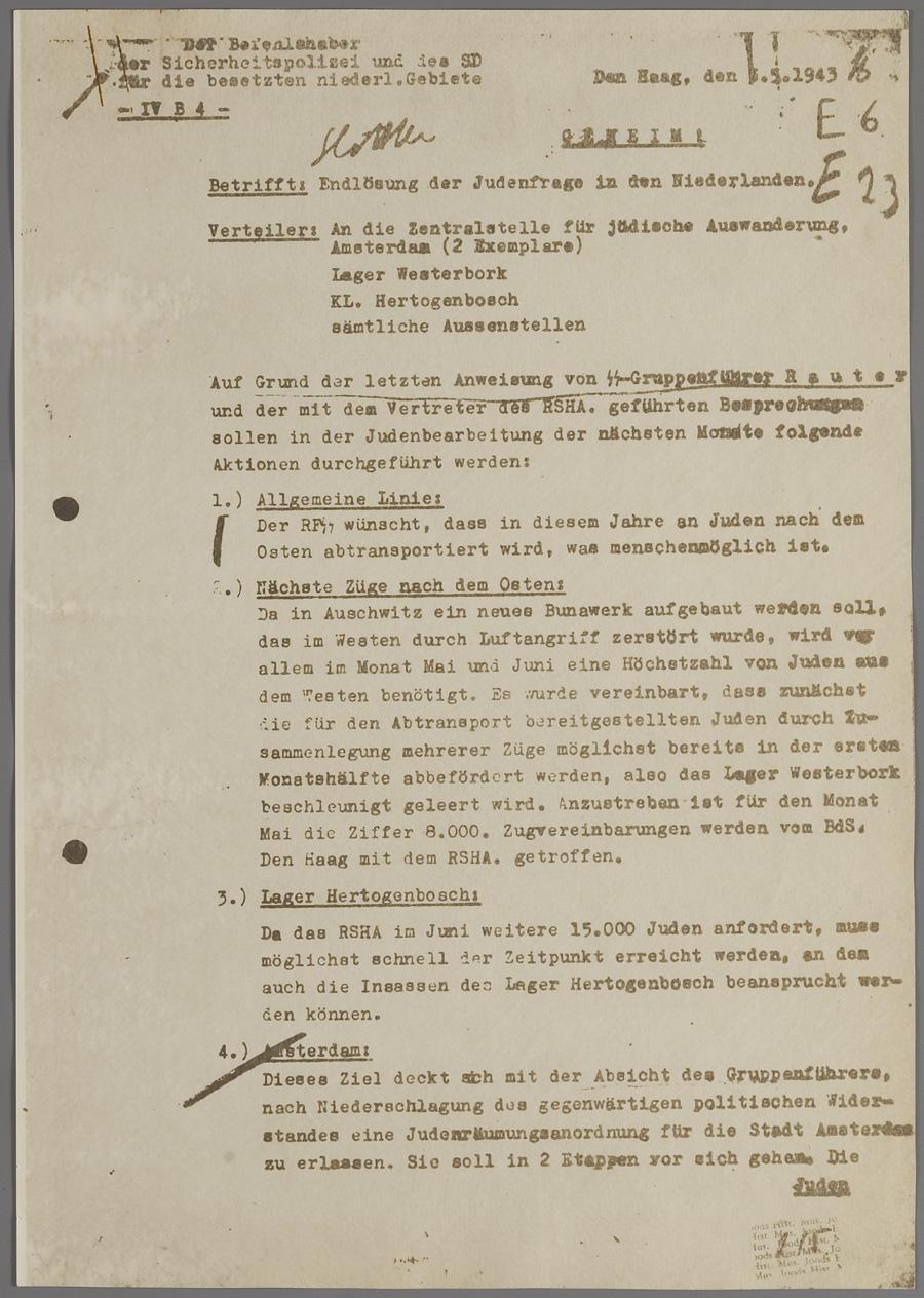 Geheim rondschrijven van Wilhelm Harster (Befehlshaber der Sicherheitspolizei en SD) aan de Zentralstelle für Jüdische Auswanderung, kamp Westerbork en Vught over te nemen maatregelen in het kader van "Endlösung der Judenfrage in den Niederlanden", mei 1943