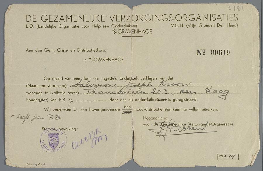 Verklaring van LO Den Haag dat Salomon Joseph Kroon als onderduiker geregistreerd staat, met verzoek hem distributiebescheiden te doen toekomen, 1945