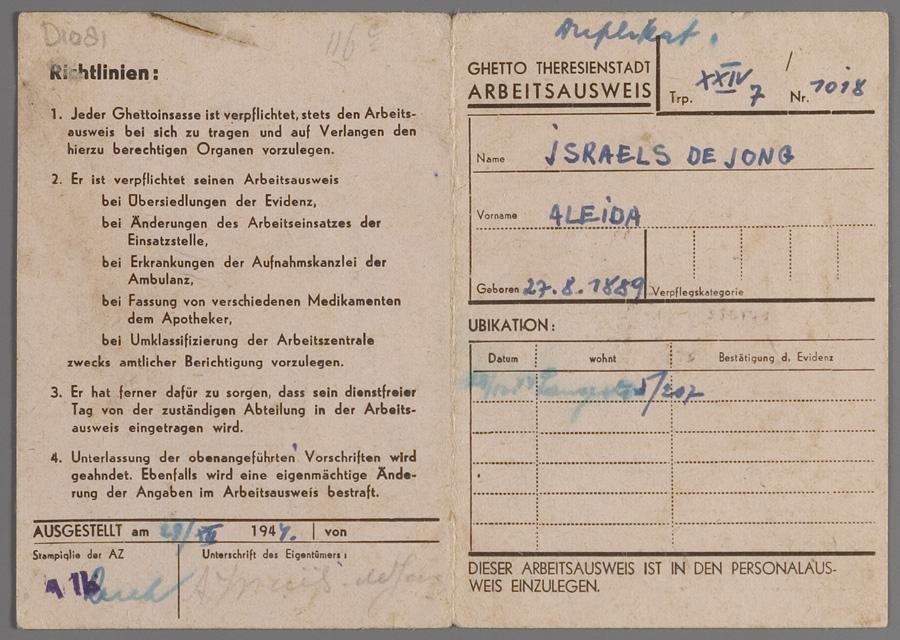 Arbeidskaart inclusief ziektekaart op naam van Aleida Israels-de Jong, Theresienstadt, 1944