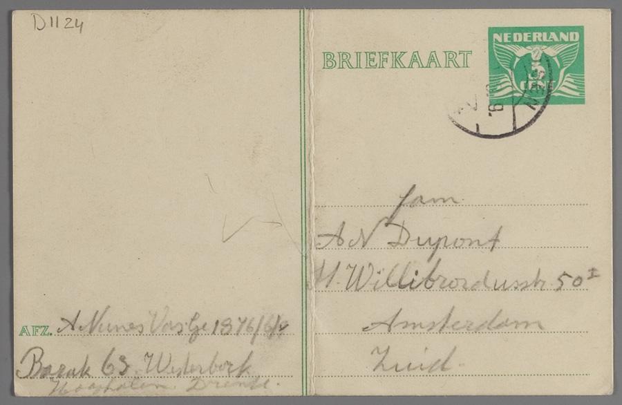 Briefkaart van A. Nunes Vaz uit Westerbork aan Arnold Dupont met dank voor ontvangen pakket