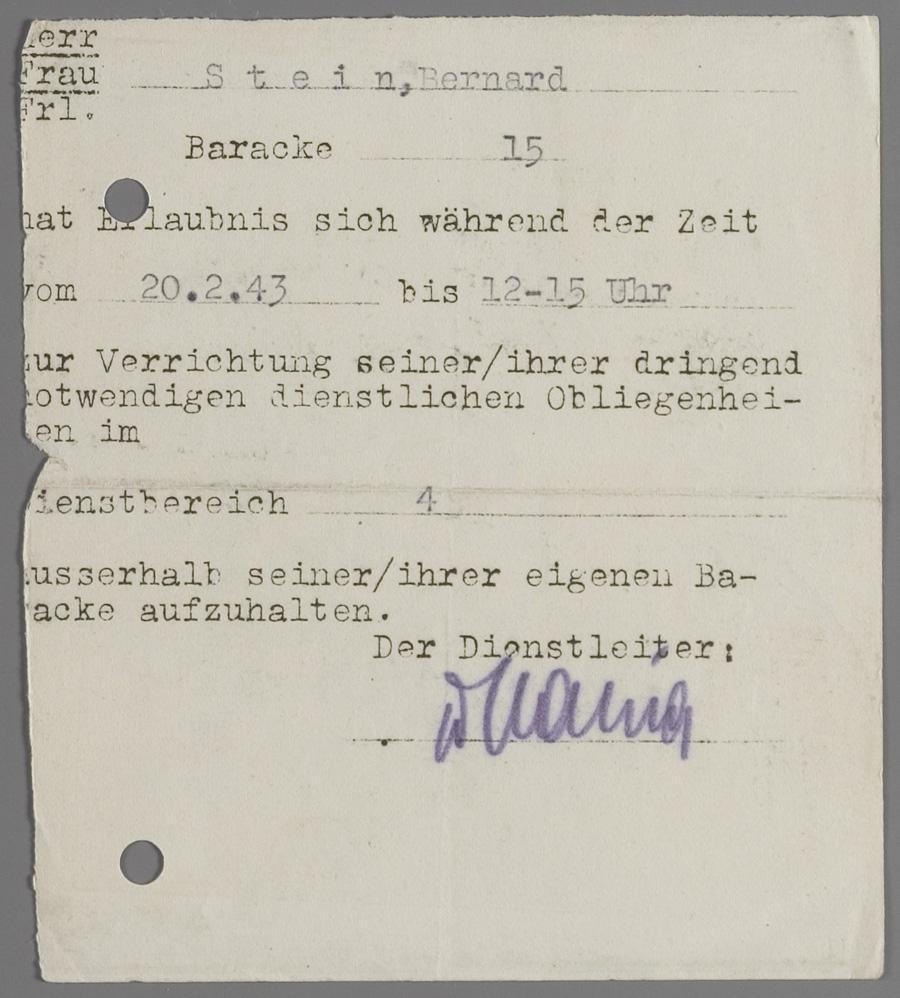 Vergunning van kamp Westerbork, op naam van Bernhard Stein om zich, binnen bepaalde tijden, buiten de eigen barak te begeven, februari 1943