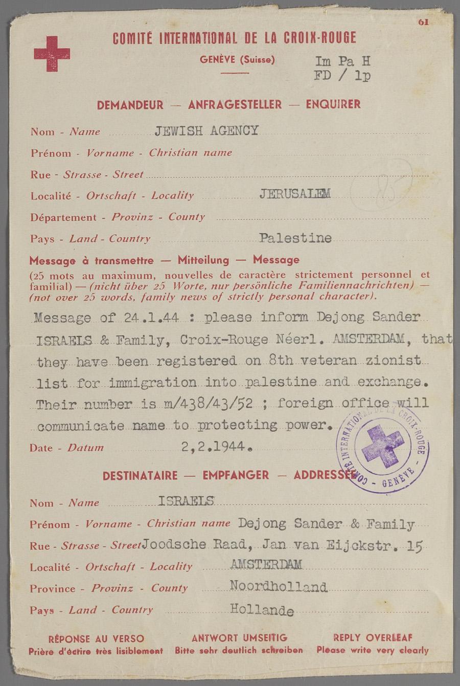 Telegrammen (4) van Jewish Agency for Palestine aan familie Israels, via Rode Kruis, over Palestina-lijst, Geneve, februari 1944
