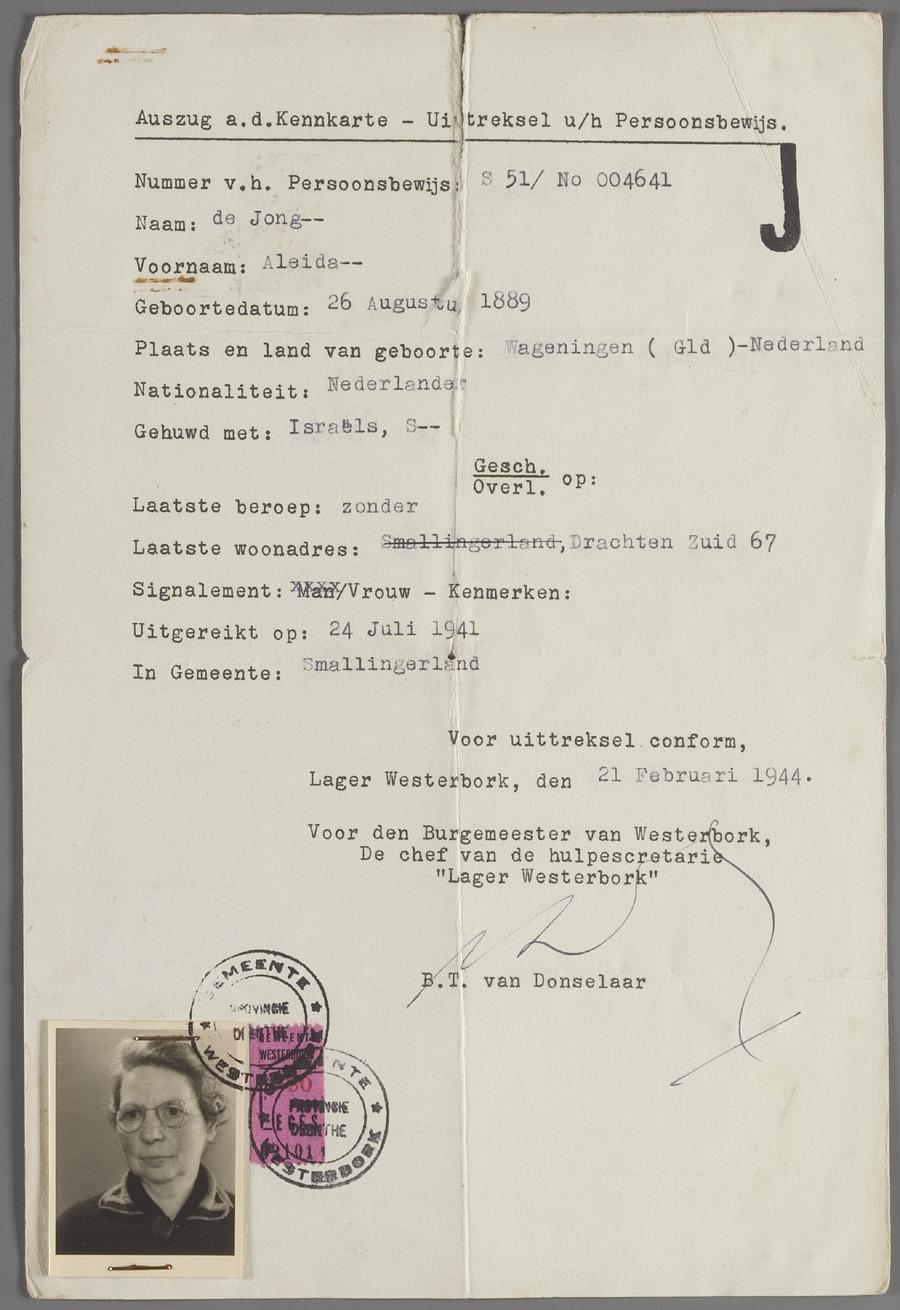 Uittreksel uit het persoonsbewijs van Aleida Israels-de Jong, Westerbork, februari 1944