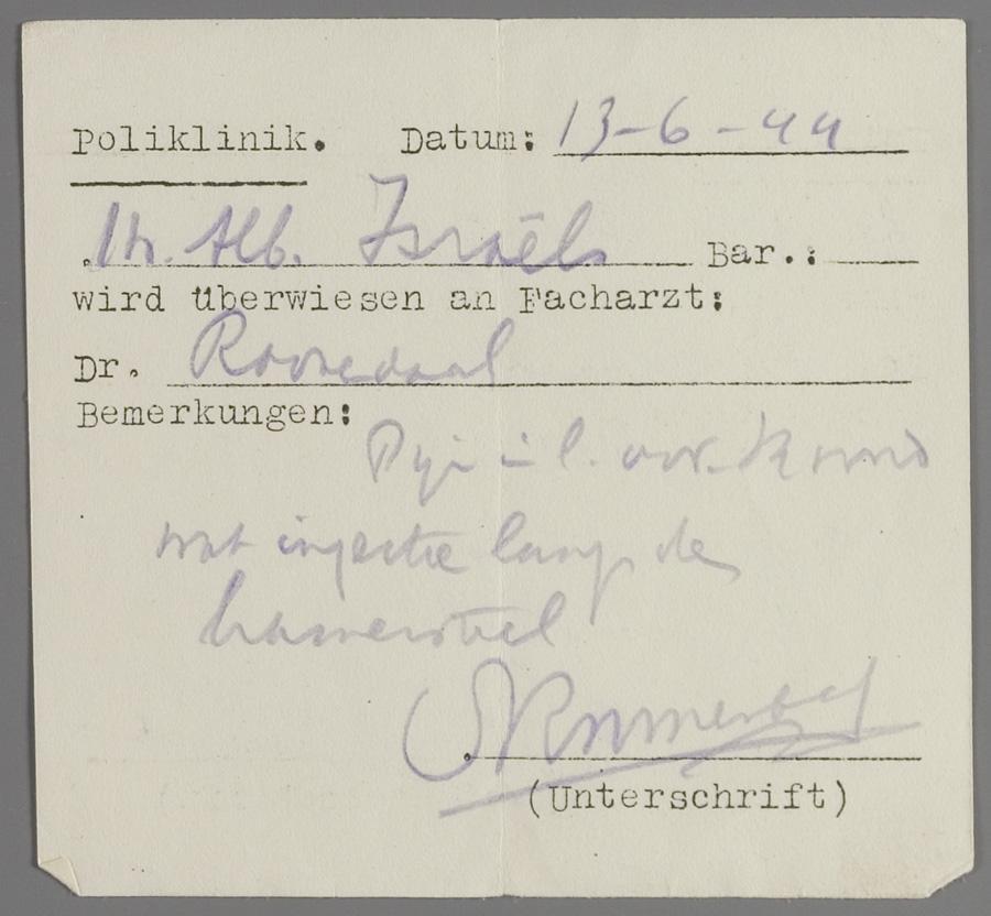 Doktersverwijzing voor Albertus Leonard Maurits Israels naar dokter Roozendaal, Westerbork, juni 1944