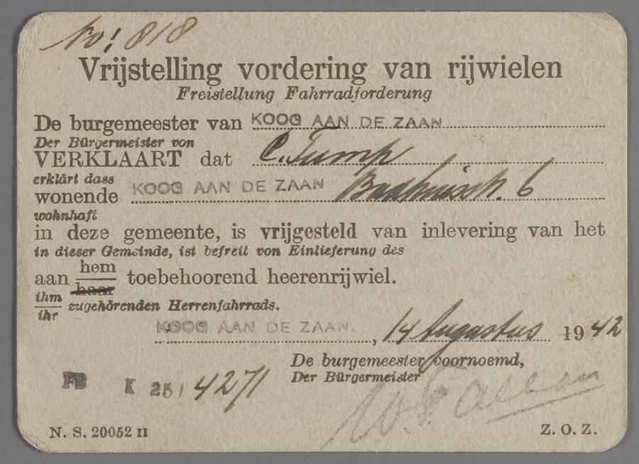 Verklaring betreffende vrijstelling inlevering herenrijwiel op naam van C. Tump, 1942