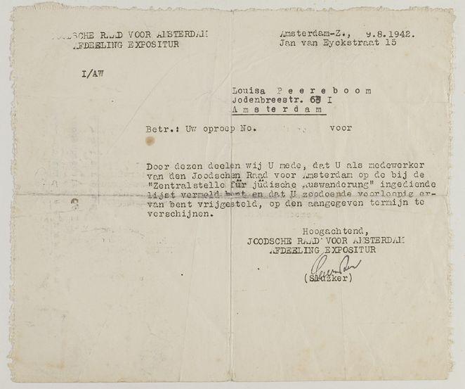 Brief van Joodse Raad aan Louisa Peereboom dat zij als medewerkster van de Joodse Raad voorlopig uitstel heeft van tewerkstelling, augustus 1942