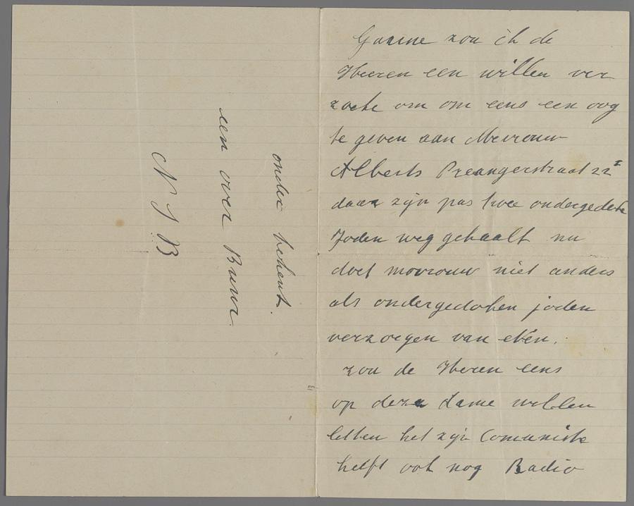 Brief aan de "Duitsche politie" met aanklacht tegen overbuurvrouw "mevrouw Alberts, Preangerstraat 22 I" die joden verborgen hield en joden van eten voorziet, 1944