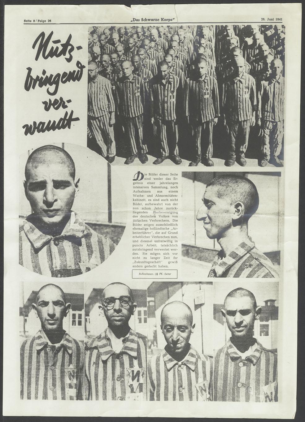Bladzijde uit een tijdschrift of krant met een anti-semitische beeldreportage van voormalige Nederlandse joodse "Arbeitersführer" (werkleiders) die nu in gestreept gevangenen-uniform op appel staan, 1941