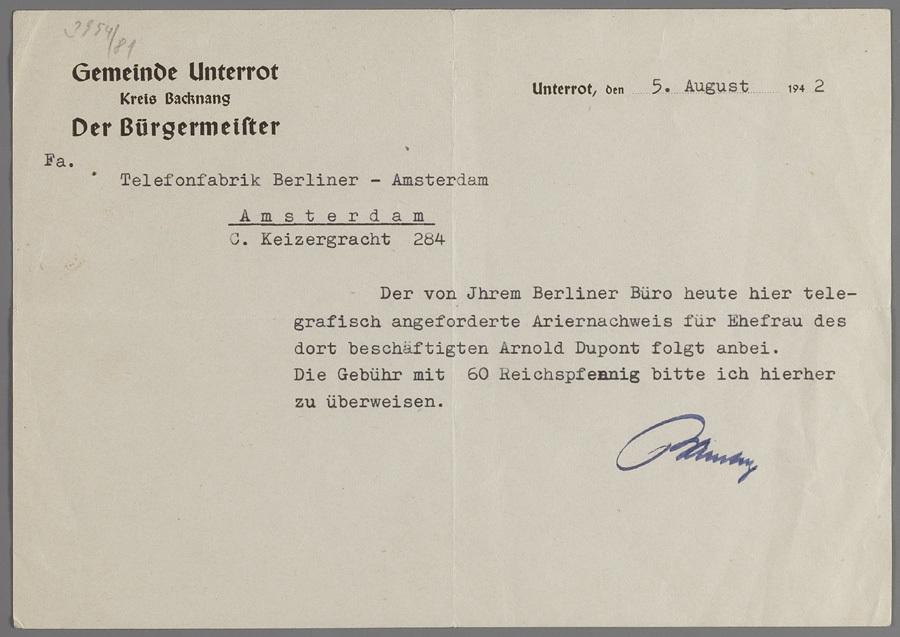 Brief van de Duitse gemeente Unterrot met de mededeling dat arierverklaring voor Lisette Windmüller, waarvoor het verzoek was ingediend door de Telefonfabrik Berliner, onderweg is, augustus 1942