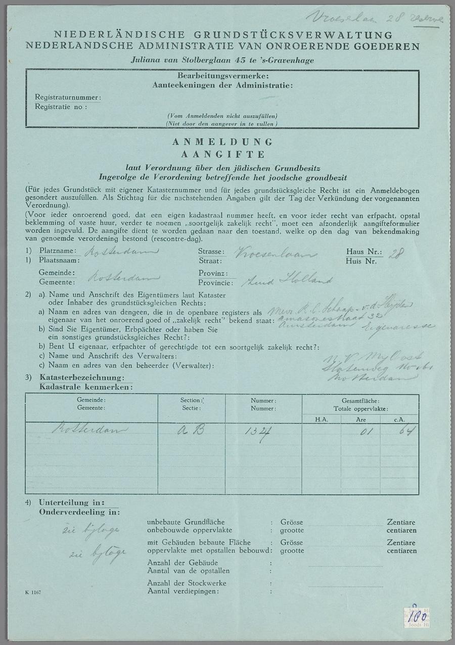 Ingevuld aanmeldingsformulier betreffende joods kadastraal bezit ten name van mevrouw R.C. Schaap-van der Heijden. Zij bezat een woning aan de Vroesenlaan 28 in Rotterdam, 1941
