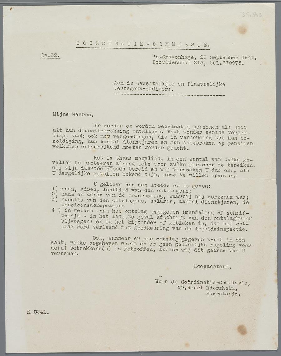 Circulaire van de Joodse Coordinatie Commissie m.b.t. ontslaan van joden, september 1941