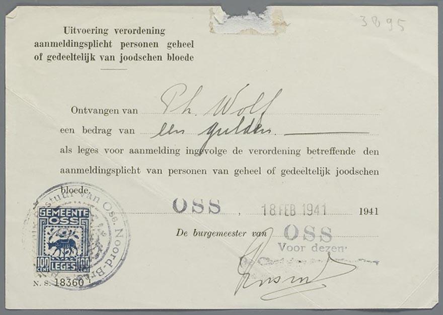 Bewijs van betaling betreffende de aanmelding als persoon van geheel of gedeeltelijk joodsen bloede, op naam van Philip Wolf, 1941