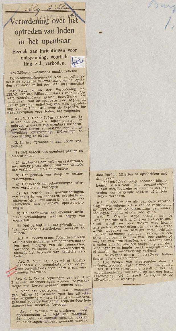 Krantenknipsels (3) van de verordeningen over het optreden van joden in het openbaar, september 1941