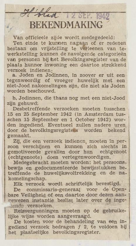 Bekendmaking (2 knipsels: Duits en Ned.) inzake aanvraag vrijstelling van tewerkstelling op grond van gemengd huwelijk, september 1942