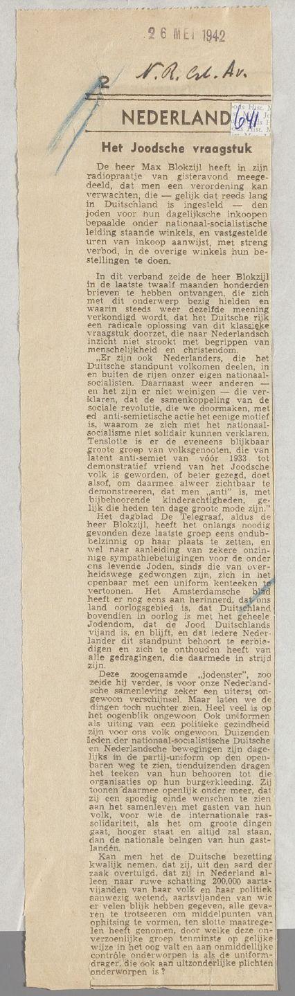 Krantenknipsel uit de N.R.C van 26 mei 1942, ingaand op de radiorede die Max Blokzijl hield over de reactie van Nederlanders op anti-joodse maatregelen