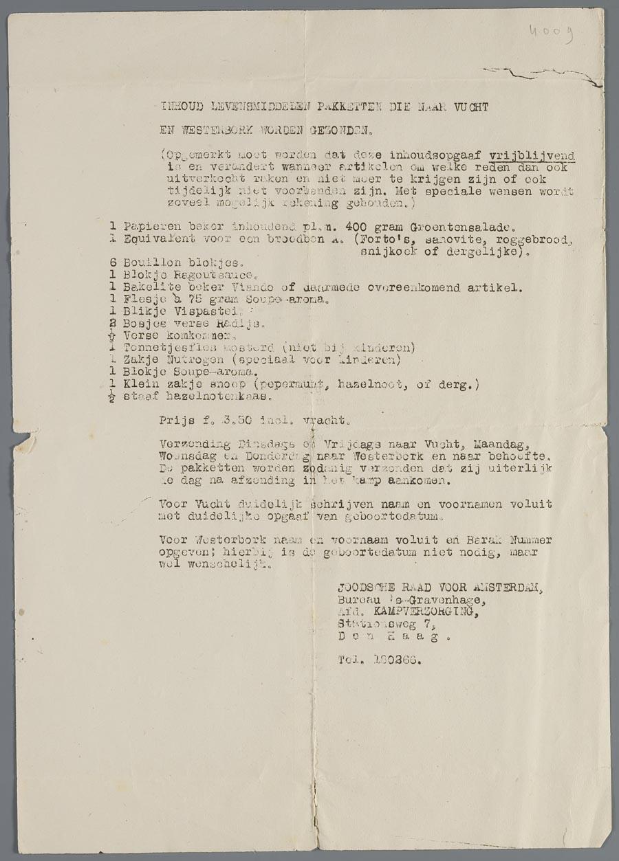 Circulaire v/d Joodse Raad m.b.t verzending levensmiddelen naar Vught en Westerbork, 1943(?)