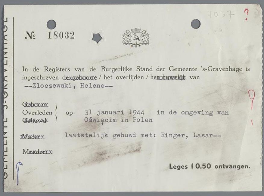 Uittreksel uit het overlijdensregister van de Gemeente Den Haag m.b.t. het overlijden van Helene Zloczewski, 1944