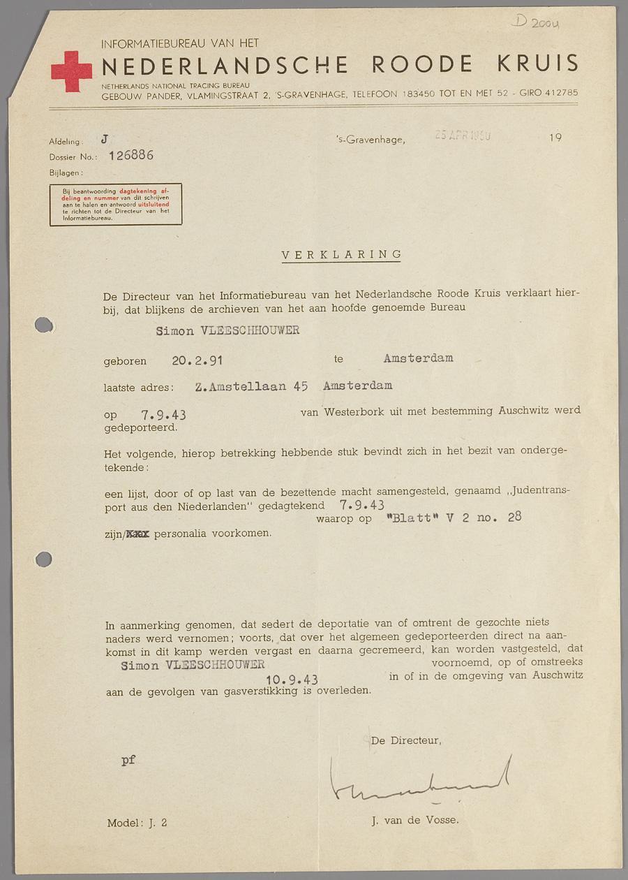 Tentoonstellingstekst Nationaal Holocaustmuseum, maart 2024 Bevestiging De afdeling J van het Nederlandse Rode Kruis deed onderzoek naar het lot van alle uit Nederland gedeporteerde mensen. Wanneer een onderzoek was afgerond, kregen nabestaanden een brief. De toon was altijd uiterst ambtelijk en onpersoonlijk, ook wanneer het bewuste familielid was vermoord.