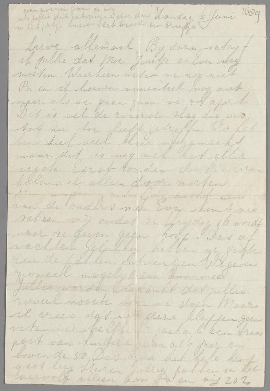 Brief van Kaatje Wurms vanuit kamp Vught over het aangekondigde verdere transport van haar moeder en twee zusjes Juultje en Eva. 'Pa' (Joseph Wurms) en zij mogen nog blijven, juni 1943