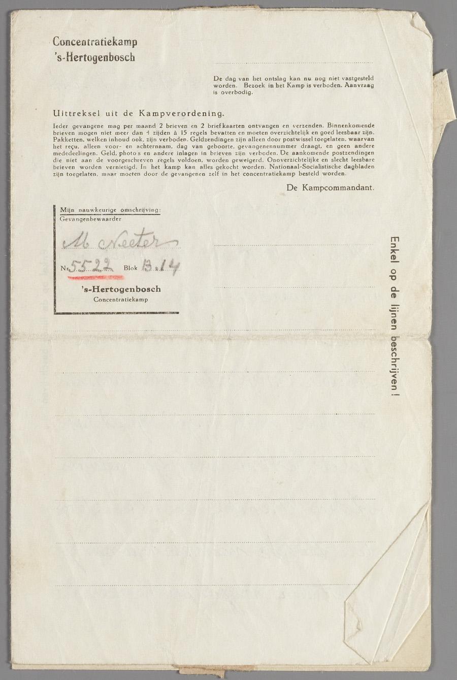 Brieven (2) uit kamp Vught van Joseph (Jopie) Wurms aan zijn schoonfamilie (= Abraham Neeter) en van M. Neeter aan zijn zoon Abraham Neeter en diens familie, 1943