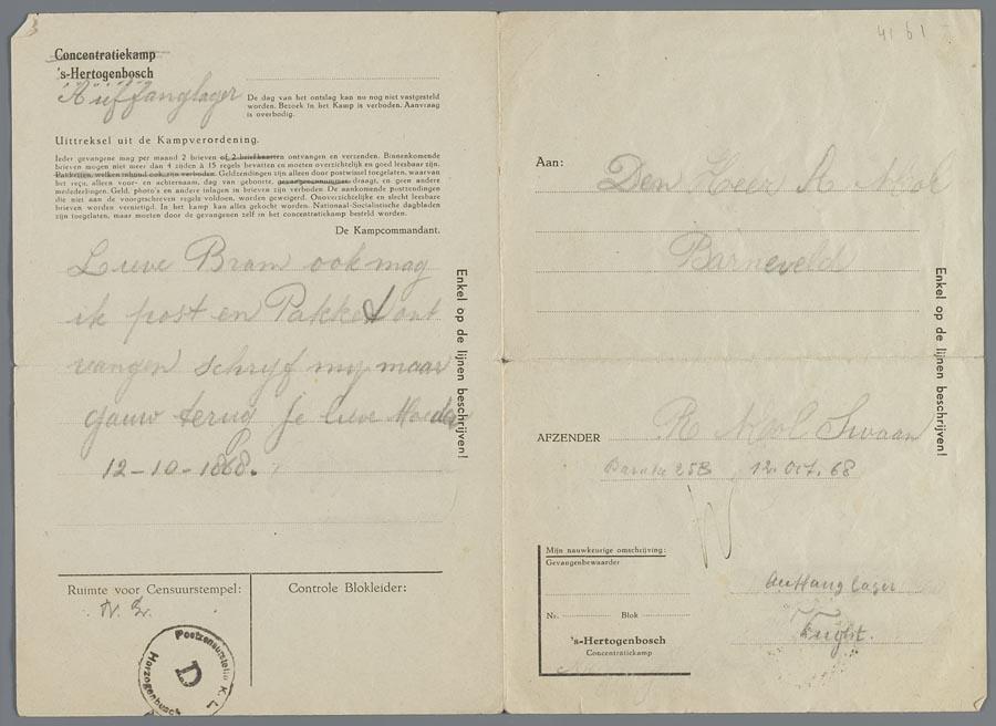 Brief van Roosje Mol-Swaan in kamp Vught aan haar zoon Abraham Mol in kamp Barnveld, 1942 (?)