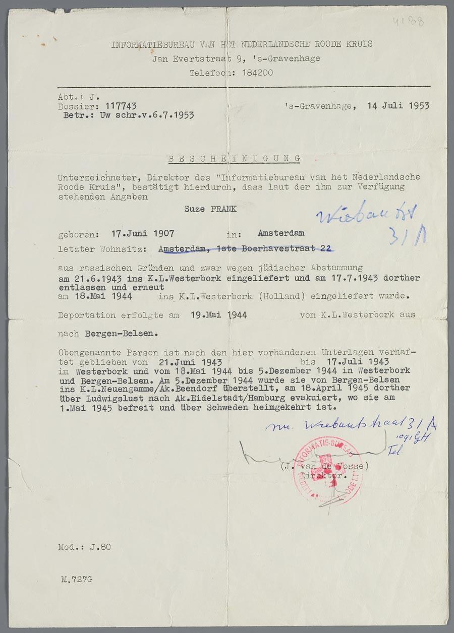 Verklaring van het Informatiebureau van het Ned. Rode Kruis, m.b.t. deportatie en bevrijding van Suze Frank, 1953