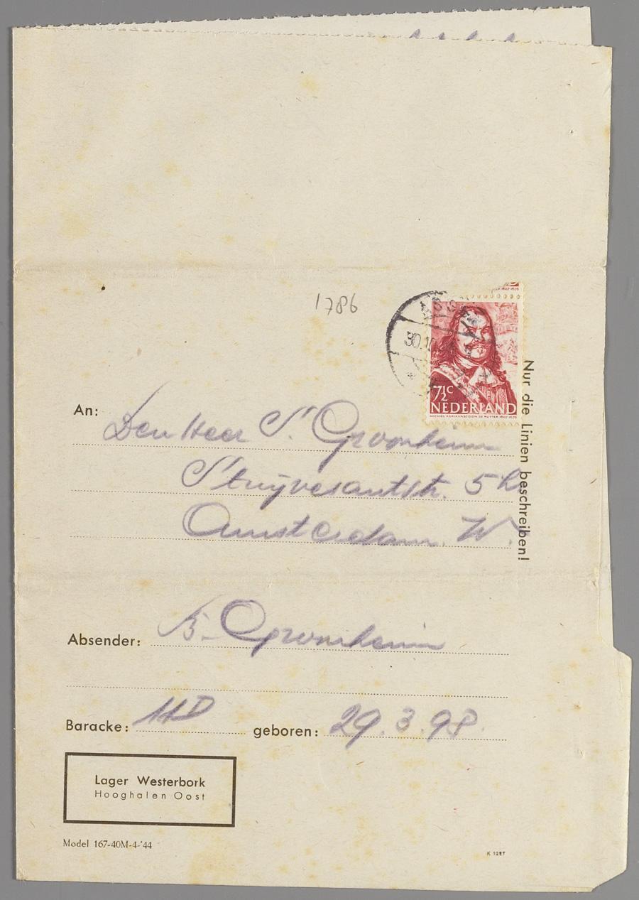 Brief uit Westerbork van B. Groonheim aan S. Groonheim, Stuyvesantstraat 5 in Amsterdam, oktober 1944