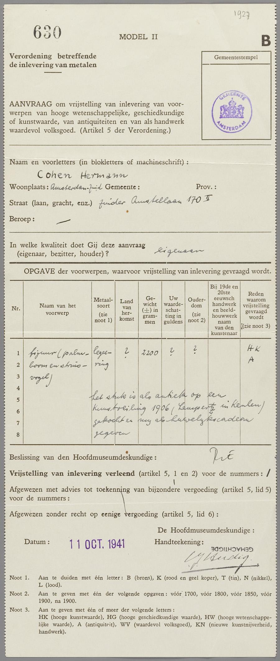 Aanvraag van Herman Cohen betreffende vrijstelling van inlevering van metalen, 1941