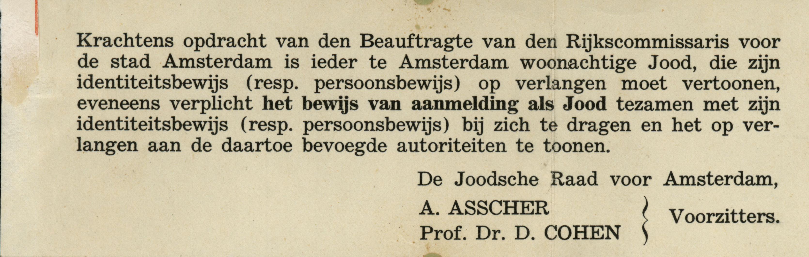 Mededeling van de Joodse Raad betreffende het bij zich dragen van bewijs van aanmelding als Jood