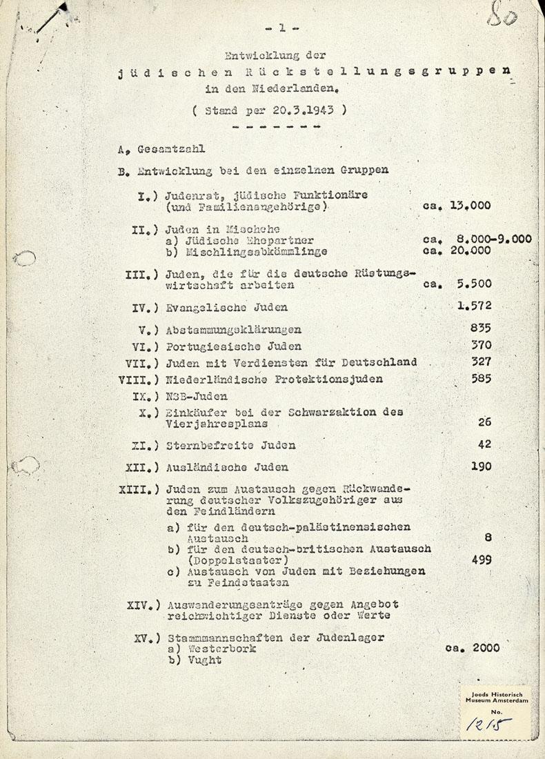 Overzicht van het aantal joden in Nederland, op 20 maart 1943, onderverdeeld in een aantal verschillende groepen, waaronder gesperrde joden, gemengd gehuwden, personen met een functie bij de Joodse Raad. Van de oorspronkelijk 46.000 joden met een bepaalde vorm van vrijstelling of uitstel wil men voor eind juni 1943 de helft deporteren.